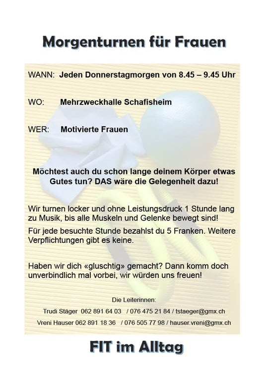 Der Frauenturnverein Schafisheim bietet Frauen Gelegenheit, in einer sportlichen und unterhaltsamen Atmosphäre ihre körperliche Leistungsfähigkeit und Gesundheit zu erhalten.